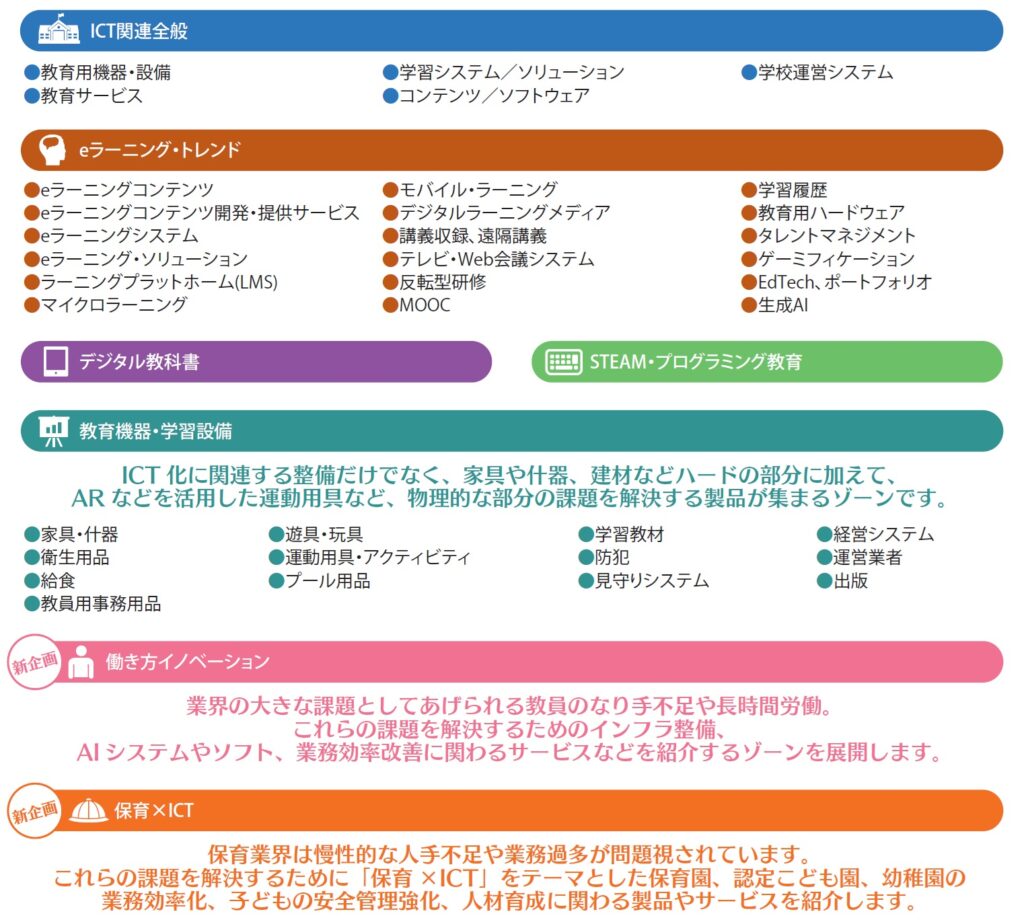 - 協賛 (前回実績、申請予定)ICT CONNECT21、学習情報研究センター、関西ICT協会、私立大学情報教育協会、全国ICT教育首長協議会、全国学習塾協会、全国地域情報化推進協会、大学ICT推進協議会、日本デジタルラーニング・コンソシアム、日本オープンオンライン教育推進協議会、日本教育工学会、日本視聴覚教育協会、日本電子出版協会、全国学習塾協同組合、才能開発教育研究財団、パナソニック教育財団、全国学校図書館協議会 ※順不同