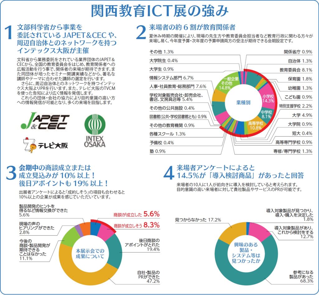 - 主催 一般社団法人日本教育情報化振興会(JAPET&CEC)、一般財団法人大阪国際経済振興センター(インテックス大阪)、テレビ大阪株式会社、株式会社テレビ大阪エクスプロ
