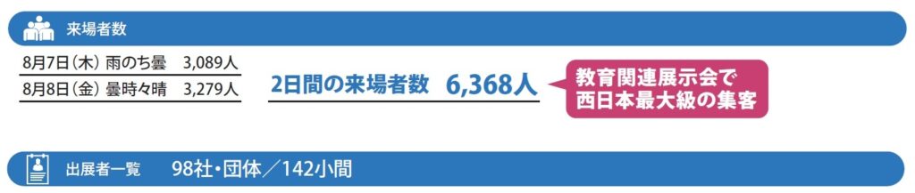 - 後援 (前回実績、申請予定)文部科学省、経済産業省、厚生労働省、総務省、大阪府、大阪市、大阪府教育委員会、京都府教育委員会、兵庫県教育委員会、奈良県教育委員会、和歌山県教育委員会、滋賀県教育委員会、三重県教育委員会、徳島県教育委員会、岡山県教育委員会、広島県教育委員会、大阪市教育委員会、京都市教育委員会、神戸市教育委員会、堺市教育委員会、姫路市教育委員会、大阪府専修学校各種学校連合会、京都府専修学校各種学校協会、兵庫県専修学校各種学校連合会、大阪私立中学校高等学校連合会、京都府私立中学高等学校連合会、兵庫県私学総連合会、大阪府私立幼稚園連盟、大阪府社会福祉協議会 保育部会、大阪市私立保育連盟、神戸市私立保育園連盟、全国認定こども園協会 ※順不同